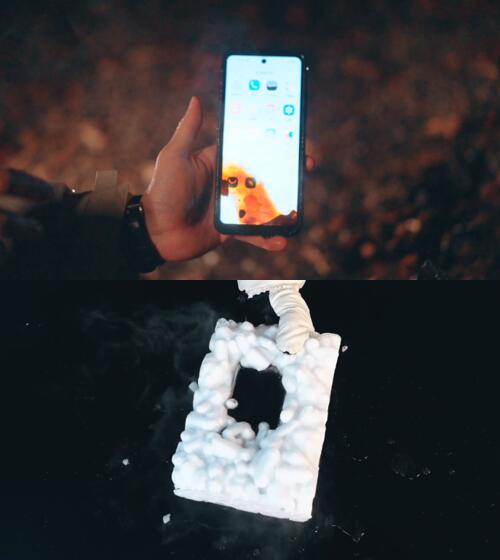 在低溫環境測試中,AGM公司并未采用傳統的冰箱冷凍方式,而是選擇了干冰作為制冷媒介。通過利用干冰汽化吸熱的特性,并結合水的使用,對AGM X6進行了速凍處理。令人驚訝的是,AGM X6在未受到水分侵被的情況下,從冰塊中取出后仍能立即開機。