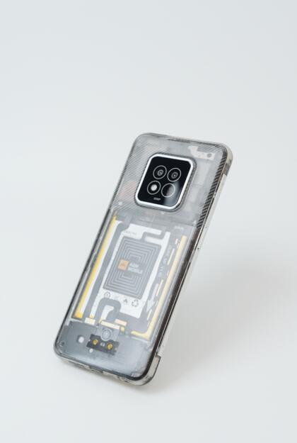 這款手機采用了磨砂透明材料作為機身,盡管材質為透明,但仍然展現了精細的紋理設計。不僅外殼,就連主板的護板也采用了半透明材質,使得內部結構如電池層次、主板與副板的連接線路等一目了然,展現出粗獷且真實的內部構造,以及如何借助強大的鋁合金骨架固定機身,再配以銀色和黑色的金屬元素,彰顯了電子設備的原始之美。