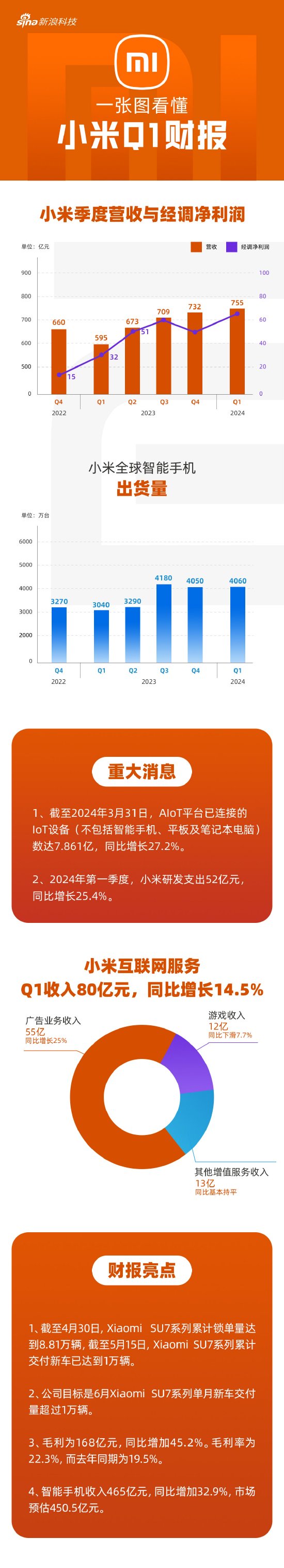 小米發布第一季度財報:營收755億元(智能手機465億+IoT與生活消費產品204億+互聯網服務80億+其他6億),同比增長27%;經調凈利潤65億,同比增長100.8%。截至4月30日,Xiaomi SU7系列累計鎖單量達到8.81萬輛,截至5月15日,Xiaomi SU7系列累計交付新車已達到1萬輛。公司目標是6月Xiaomi SU7系列單月新車交付量超過1萬輛。