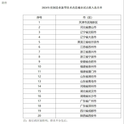 工信部公示2024年度制造業新型技術改造城市試點名單