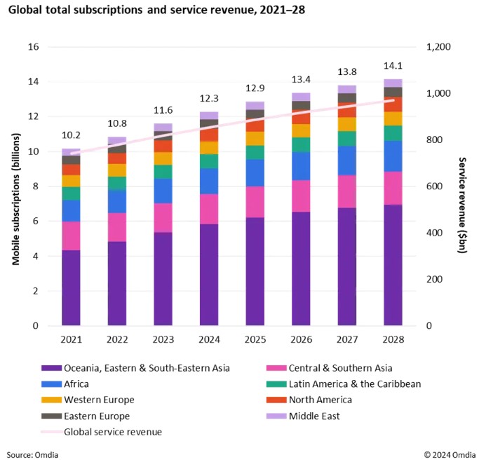 預(yù)計(jì)2023年全球移動(dòng)服務(wù)收入增長(zhǎng)5.2%,并將在預(yù)測(cè)期內(nèi)持續(xù)增長(zhǎng),到2028年擁有2.8%的增長(zhǎng)率。Omdia預(yù)測(cè),到2028年,移動(dòng)服務(wù)收入將達(dá)到9690億美元(本次預(yù)測(cè)中的所有收入均按2023年四季度的美元匯率進(jìn)行了調(diào)整),復(fù)合年增長(zhǎng)率為3.7%。