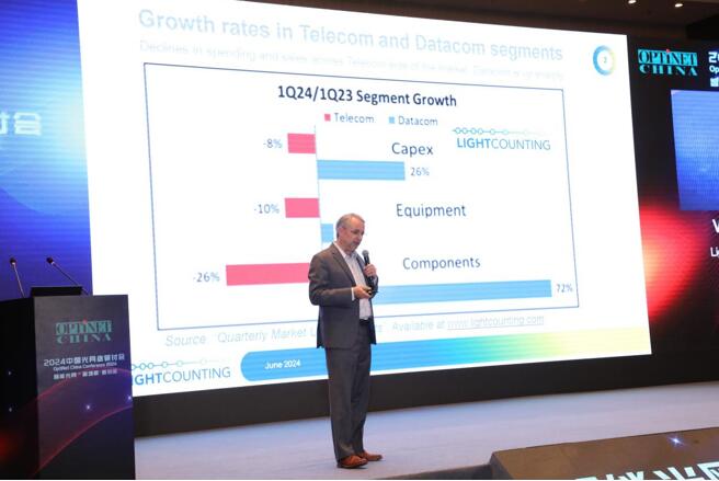 Vladimir Kozlov受邀參會,并發表《市場的兩面性:電信網絡與AI集群》主題演講。他認為,在AI集群部署方面,部分公司已經采用了800G以太網模塊,而1.2T模塊的應用預計也將很快到來。在這場由AI主導的技術競賽中,400G和800G是目前的主流,但1.6T模塊也將迎頭趕上。