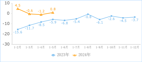 網絡銷售領域企業收入增長勢頭減弱。2024年1-5月份,主要提供網絡銷售服務的企業(包括大宗商品、農副產品、綜合電商、醫療用品、快遞等)互聯網業務收入同比增長3.3%,增速較1-4月份回落10.5個百分點。