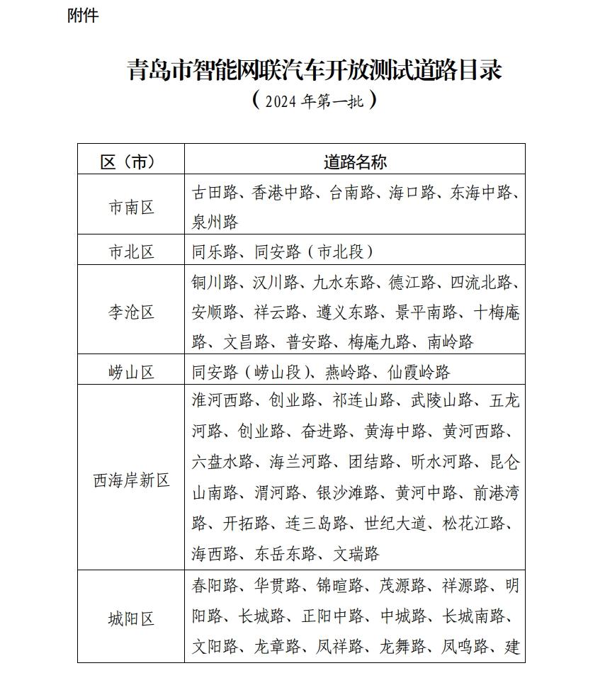 此外,青島市工業(yè)和信息化局也發(fā)布了《關(guān)于公布青島市智能網(wǎng)聯(lián)汽車開放測試道路目錄(2024 年第一批)的通知》,涉及市南區(qū)、市北區(qū)等八個區(qū)(市)共 121 條道路,其中部分道路僅開放特定路段。