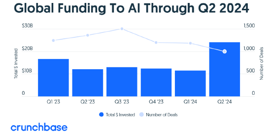 企業數據提供商Crunchbase今日發布報告稱,今年第二季度,全球AI初創公司共獲得240億美元的投資,環比增長一倍多,凸顯了投資者對AI的胃口日益增長。