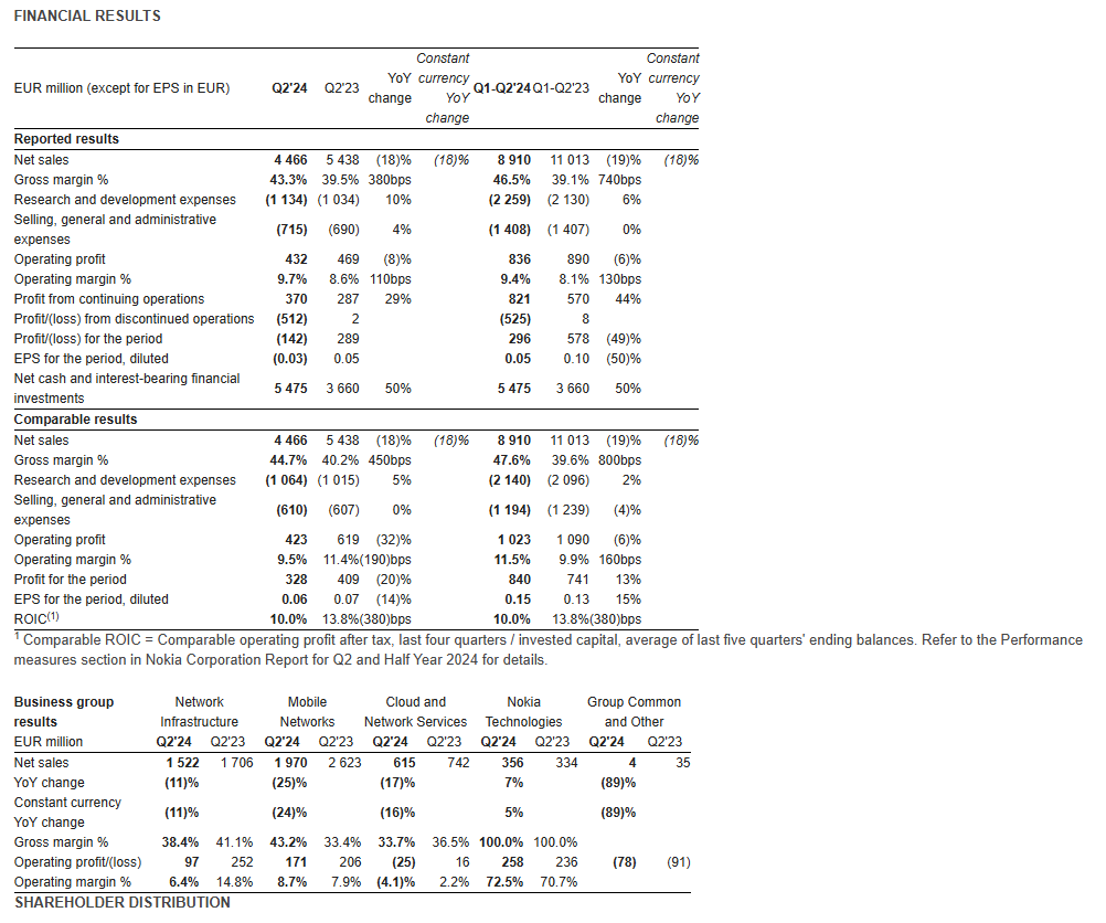 諾基亞現公布了 2024 年第二季度及上半年業績報告,按固定匯率計算 Q2 凈銷售額同比下降 18% 至 44.7 億歐元(IT之家備注:當前約 355.1 億元人民幣)。