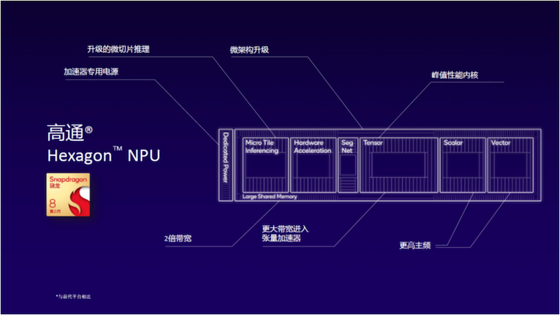 以目前正在被大量旗艦智能手機采用的第三代驍龍8為例,高通為了實現更好的功耗控制,專門為Hexagon NPU配備了加速器專用電源,同時進行了微架構升級以實現性能提升。今年2月的MWC巴塞羅那期間,高通首次在Android平臺上通過搭載第三代驍龍8參考設計的終端運行了基于圖像和文本輸入、超過70億參數的大語言和視覺助理大模型技術演示,再次證明了終端側AI的能力潛質。