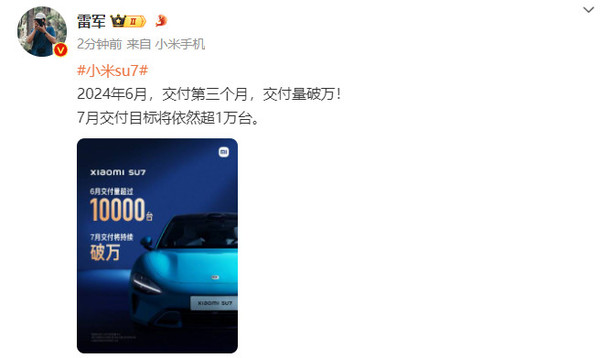6月小米SU7交付量超10000臺 雷軍:7月交付目標依舊