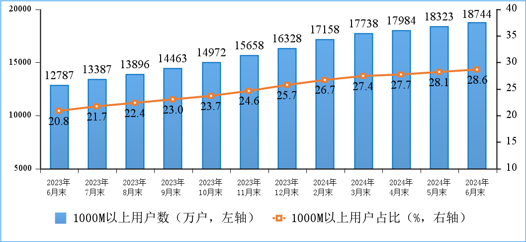 千兆用戶規(guī)模持續(xù)擴大,截至2024年6月末,1000Mbps及以上接入速率的固定互聯(lián)網(wǎng)寬帶接入用戶達1.87億戶,比上年末凈增2416萬戶,占總用戶數(shù)的28.6%,占比較一季度提升1.2個百分點。在高速率用戶持續(xù)增長拉動下,家庭戶均接入帶寬達487.6Mbps/戶,同比增長17.9%。