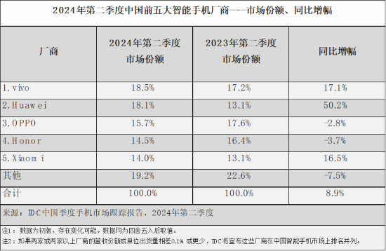 飛象網(wǎng)訊 國際數(shù)據(jù)公司(IDC)發(fā)布的最新手機季度跟蹤報告顯示,2024年第二季度,中國智能手機市場出貨量約7,158萬臺,同比增長8.9%,延續(xù)增長勢頭。今年上半年中國智能手機市場出貨量超過1.4億臺,同比增長7.7%。