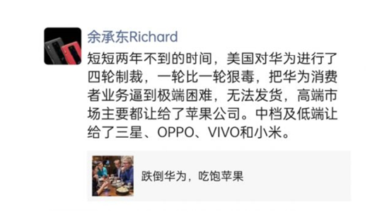 此前華為手機業務遭遇困境之時,外界就傳出了“華為跌倒,蘋果吃飽”的說法。2021年時,華為終端BG董事長余承東在朋友圈表示:“短短兩年不到的時間,美國對華為進行了四輪制裁,一輪比一輪狠毒,把華為消費者業務逼到極端困難,無法發貨 ”。他還認為,華為手機的“高端市場主要讓給了蘋果,中檔及低端讓給了OPPO、vivo和小米”。