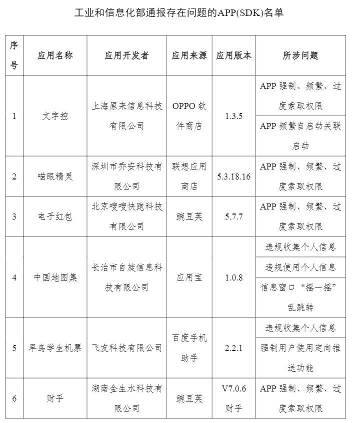 工信部通報17款侵害用戶權益行為APP(SDK)