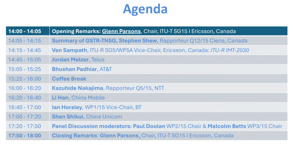 2024年7月1~13日,國(guó)際電信聯(lián)盟標(biāo)準(zhǔn)化部門(ITU-T)第15研究組(SG15)全會(huì)在加拿大蒙特利爾召開,共有來自幾十個(gè)國(guó)家的200多名標(biāo)準(zhǔn)代表現(xiàn)場(chǎng)參會(huì)。會(huì)議期間(7月7日)召開了一次主題為《 The Evolution of Transport and Access Networks to Support IMT 2030/6G》的高峰論壇【1】。論壇由SG15主席Glenn Parsons先生,聯(lián)合SG15管理層WP2主席Paul Doolan先生和WP3主席 Malcolm Betts先生共同主持,來自Ciena,Ericsson,Telus, AT&T, NTT, 中國(guó)移動(dòng),BT和中國(guó)聯(lián)通的多位專家相繼發(fā)表精彩演講。