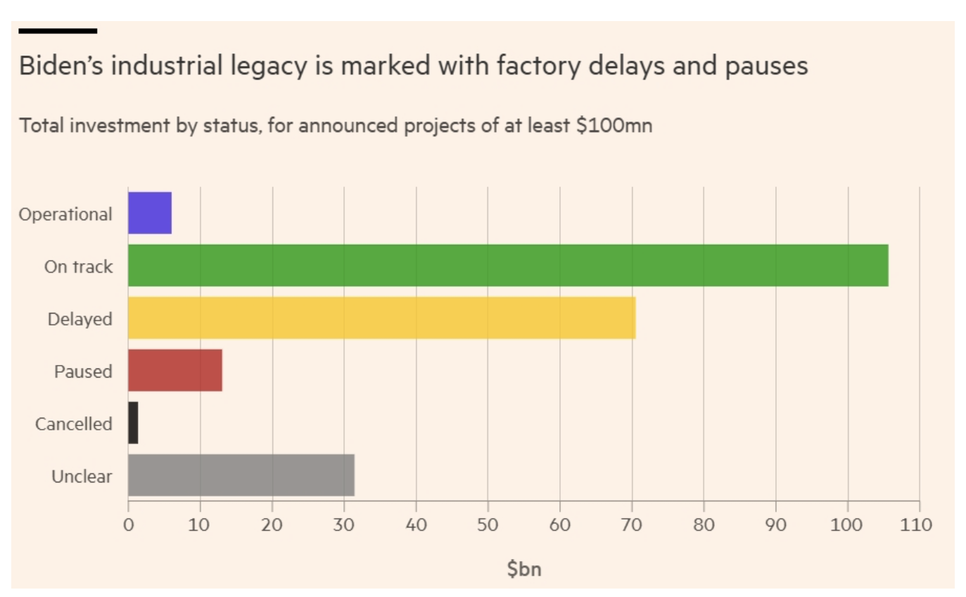 此外,一些延遲是政策驅動的。美國政府緩慢推出《芯片法案》資助半導體項目,以及通脹削減法案(IRA)規則缺乏明確性,導致許多項目陷入停滯。