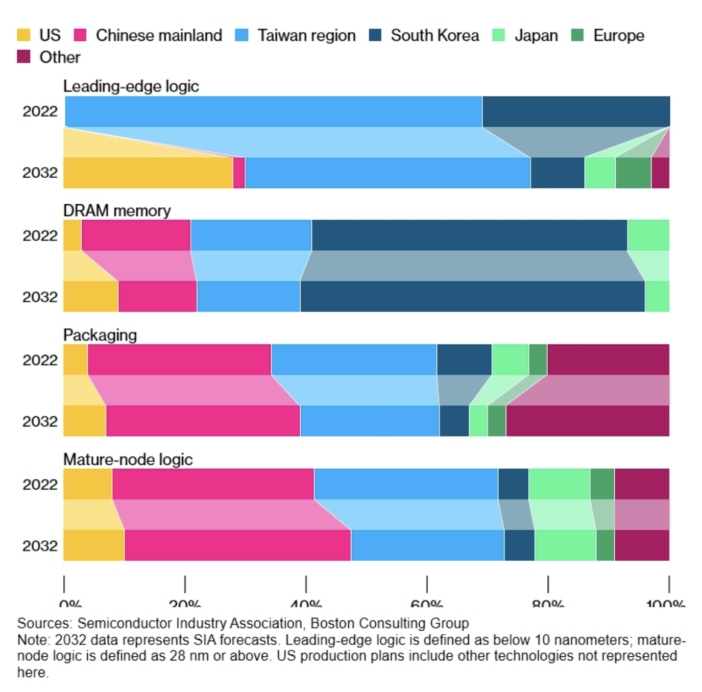 美國半導體產業協會(SIA)預計,到2032年美國在全球晶圓廠產能中的份額將從目前的10%上升至14%。如果沒有《芯片法案》,這一比例將下滑至8%。