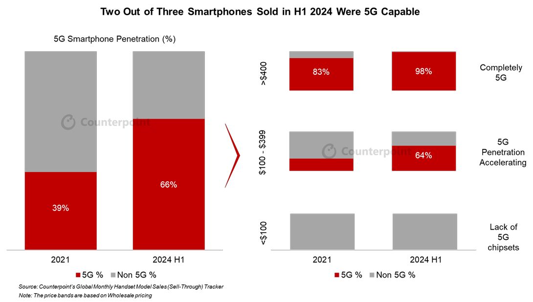 8 月 2 日消息,根據市場調查機構 Counterpoint Research 公布的最新報告,預估 2024 年上半年全球每售出 3 臺智能手機,就有 2 臺具備 5G 功能,滲透率為 66.7%。