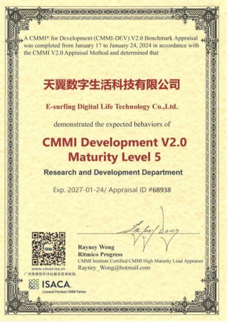 天翼數字生活公司在技術創新領域的卓越表現,離不開其深厚的技術積累與人才支撐。近三年,天翼數字生活公司申請并獲得知識產權1000多項(其中發明專利近500件)、制訂并發布國際國家行業企業等標準30多項。2024年1月,經國際權威機構評估,順利通過全球軟件領域CMMI5級認證,在軟件技術研發、軟件過程管理能力等方面成功接軌國際標準,達到國際領先水平,這也為數字生活業務的快速發展提供了堅實的技術保障。
