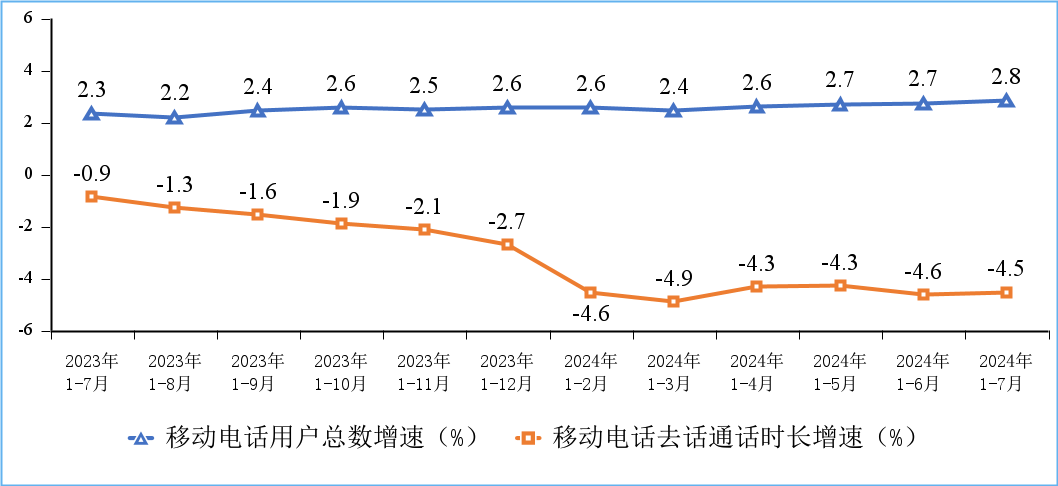 電話通話量小幅下降,移動(dòng)短信量收平穩(wěn)增長(zhǎng)。1—7月份,移動(dòng)電話去話通話時(shí)長(zhǎng)完成12518億分鐘,同比下降4.5%;固定電話主叫通話時(shí)長(zhǎng)完成450.7億分鐘,同比下降2.1%。1—7月份,全國(guó)移動(dòng)短信業(yè)務(wù)量同比增長(zhǎng)1%;移動(dòng)短信業(yè)務(wù)收入同比增長(zhǎng)1.6%。