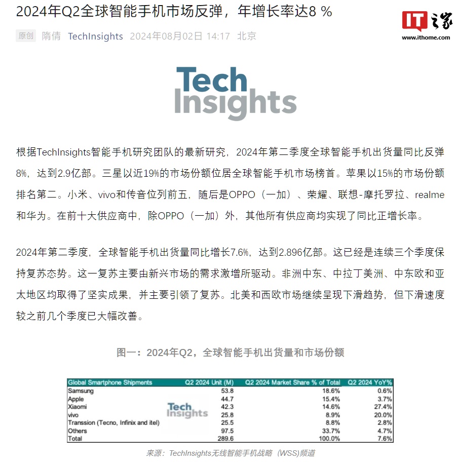 市場調(diào)研機(jī)構(gòu) TechInsights 今天發(fā)布 2024 年第二季度全球智能手機(jī)出貨報告,數(shù)據(jù)顯示該季度全球智能手機(jī)出貨量同比反彈 7.6%,達(dá)到 2.896 億部。