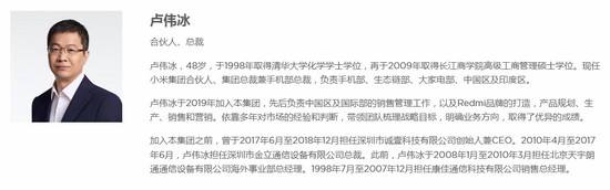 公開資料顯示,曾學忠1996年畢業于清華大學,在加入小米前曾任中興終端公司CEO、中興全球副總裁、紫光股份有限公司總裁等職位;盧偉冰畢業于清華大學化學系,2019 年加入小米集團,先后負責中國區及國際部的銷售管理工作,以及 Redmi 品牌的打造,產品規劃、生產、銷售和營銷。