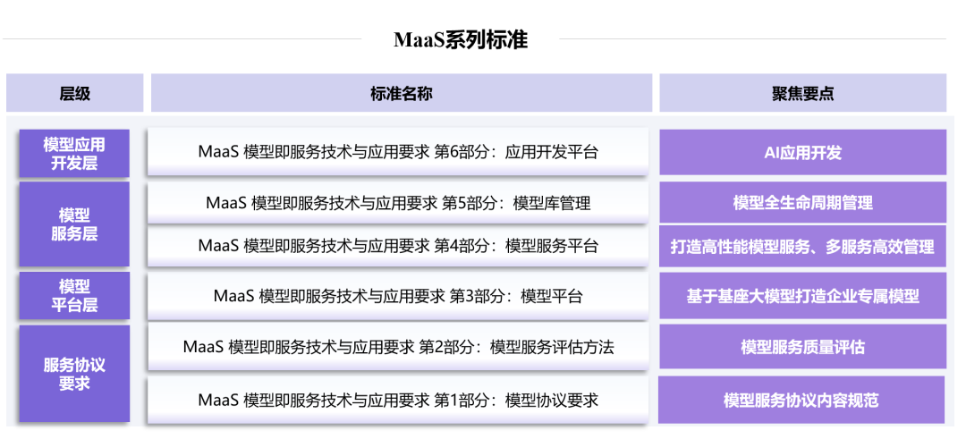 中國信息通信研究院(簡稱“中國信通院”)緊跟MaaS領域最新發展趨勢,依托中國人工智能產業發展聯盟組建MaaS工作組,自2023年起聯合產業各界啟動研制MaaS系列標準,現階段性發布該系列標準的已完成部分,并同步征集未完成部分的參編專家。