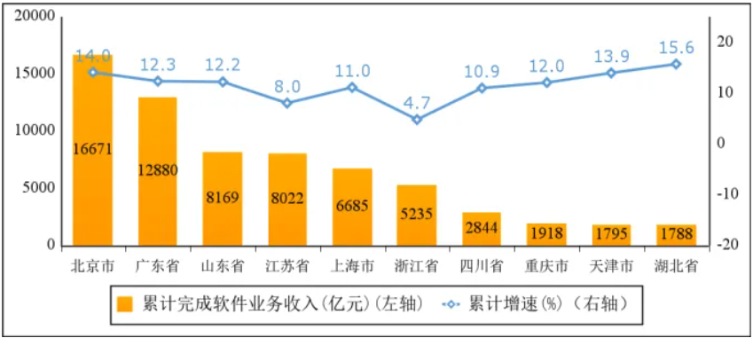 主要軟件大省業務收入持續向好。1—7月,軟件業務收入居前5名的省份中,北京、廣東、山東、江蘇、上海軟件收入分別為16671億元、12880億元、8169億元、8022億元和6685億元,同比分別增長14%、12.3%、12.2%、8%和11%,5省(市)合計軟件業務收入52428億元,占全國比重為71.4%,占比較去年同期提高0.5個百分點。