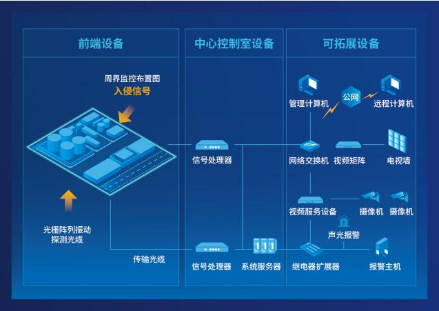 光柵陣列周界入侵報警系統作為新一代安防監測系統,利用無源光纖傳感技術使得系統在不需要任何戶外有源器件的情況下能夠提供長距離監控,提供實時、可靠的入侵報警,使得相關人員能夠迅速準確做出相應的行動。并可與視頻、紅外、門禁等系統聯動構建整體安防監控體系。