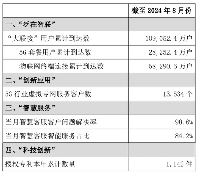 在創(chuàng)新應(yīng)用方面,中國聯(lián)通5G行業(yè)虛擬專網(wǎng)服務(wù)客戶數(shù)達(dá)13534個(gè)。在智慧服務(wù)方面,當(dāng)月智慧客服客戶問題解決率為98.6%,智能服務(wù)占比為84.2%。在科技創(chuàng)新方面,本年累計(jì)授權(quán)專利數(shù)量為1142件。