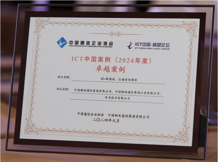 9月25日,在北京國家會議中心舉行的2024年中國國際信息通信展覽會上,由中國通信企業協會發起的“ICT中國(2024)案例征集與發布”年度評選活動正式揭曉,中國移動集團,中國移動江蘇有限公司與華為聯合申報的“AI+新通話,讓通話更精彩”被評為一等獎(卓越案例)。