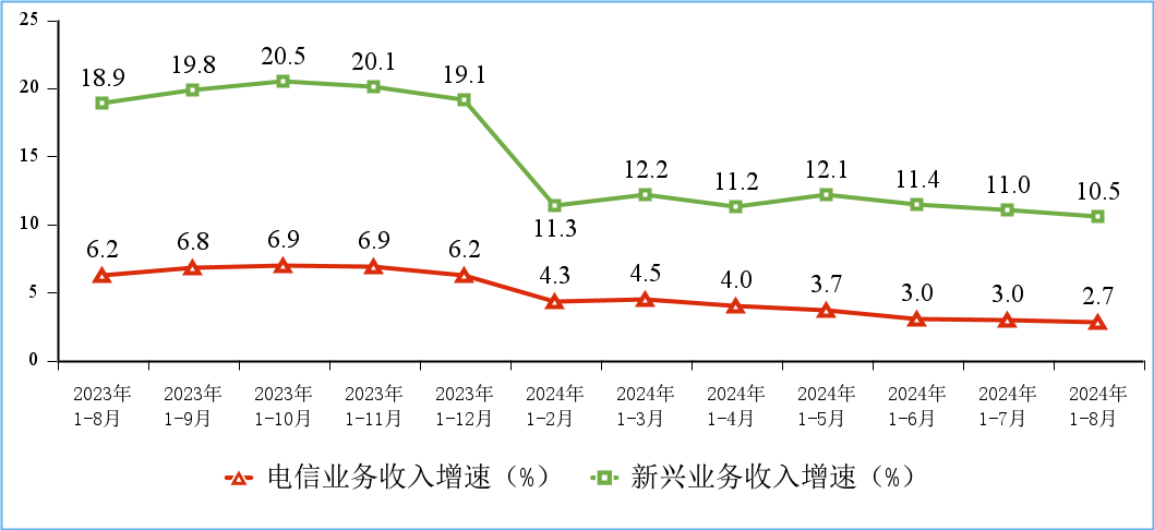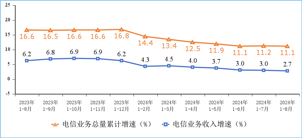 電信業務總量保持兩位數增長,電信業務收入增速穩中有落。前8個月,電信業務收入累計完成11732億元,同比增長2.7%。按照上年不變價計算的電信業務總量同比增長11.1%。