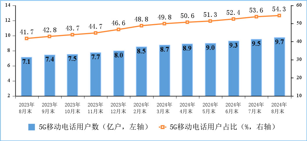 5G用戶規模持續擴大。截至8月末,三家基礎電信企業及中國廣電的移動電話用戶總數【注1】達17.78億戶,比上年末凈增3452萬戶。其中,5G移動電話用戶達9.66億戶,比上年末凈增1.44億戶,占移動電話用戶的54.3%,占比較上年末提高7.7個百分點。
