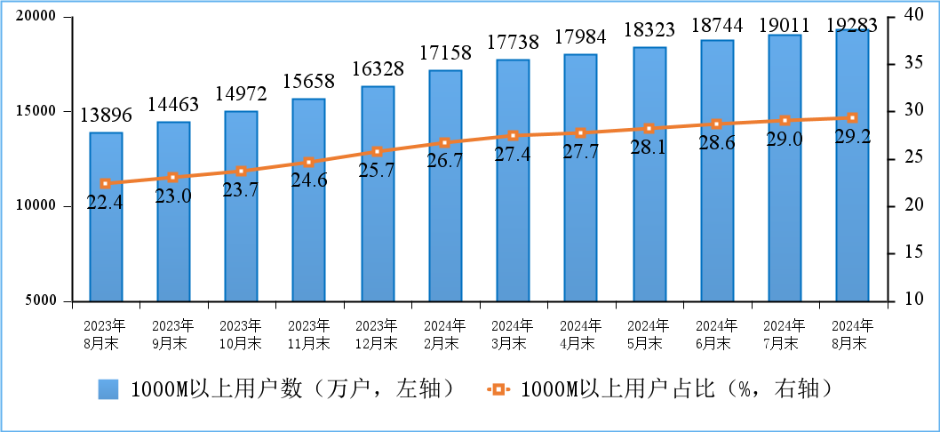 千兆用戶快速發展。截至8月末,三家基礎電信企業的固定互聯網寬帶接入用戶總數達6.59億戶,比上年末凈增2307萬戶。其中,100Mbps及以上接入速率的固定互聯網寬帶接入用戶達6.25億戶,占總用戶數的94.8%;1000Mbps及以上接入速率的固定互聯網寬帶接入用戶達1.93億戶,比上年末凈增2955萬戶,占總用戶數的29.2%,占比較上年末提升3.5個百分點。在高速率用戶持續增長拉動下,家庭戶均接入帶寬達494.7Mbps/戶,同比增長15.5%。
