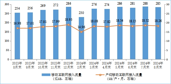 移動互聯網流量較快增長,8月DOU值位于較高水平。前8個月,移動互聯網累計流量【見注1】達2176億GB,同比增長12.5%。截至8月末,移動互聯網用戶數【見注1】達15.63億戶,比上年末凈增3879萬戶。8月當月戶均移動互聯網接入流量(DOU)達到18.26GB/戶·月,同比增長7.4%,比上年同期提升1.26GB/戶·月。