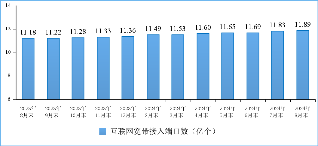 千兆光纖寬帶網絡建設有序推進。截至8月末,全國互聯網寬帶接入端口數量達11.89億個,比上年末凈增5278萬個。其中,光纖接入(FTTH/O)端口達到11.48億個,比上年末凈增5343萬個,占互聯網寬帶接入端口的96.6%。截至8月末,具備千兆網絡服務能力的10G PON端口數達2707萬個,比上年末凈增405.4萬個。