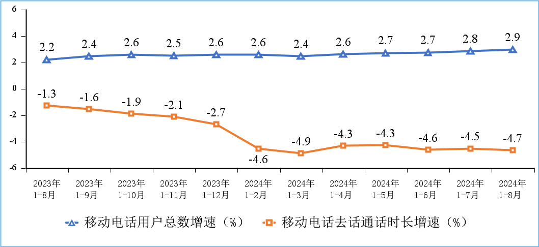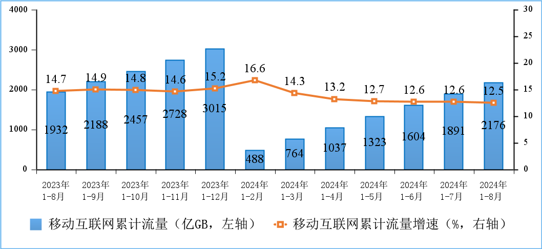 2024年前8個月,通信行業運行基本平穩,電信業務量收保持增長,5G、千兆光網等新型基礎設施建設持續推進,網絡連接用戶規模不斷擴大,移動數據流量延續較快增長態勢。