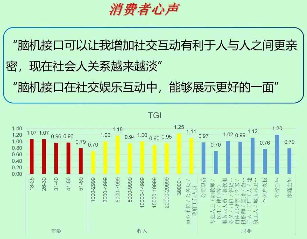 腦機接口技術在意念控制游戲場景上的應用,主要體現在通過讀取和解碼大腦的神經信號,實現對游戲角色或界面的直接控制。如意念控制光標移動和持握、意念控制機器人移動和拿取物體、腦控交互游戲、意念控制VR游戲中的動作等。這些應用展示了腦機接口技術在游戲領域的潛力,它們為玩家提供了一種全新的、沉浸式的游戲體驗,同時也為殘疾人士提供了參與游戲的新途徑。隨著技術的進一步發展,未來意念控制游戲的場景將更加豐富和完善。調查顯示,18-30歲、自由職業、工人、學生等對這一場景關注度較高。