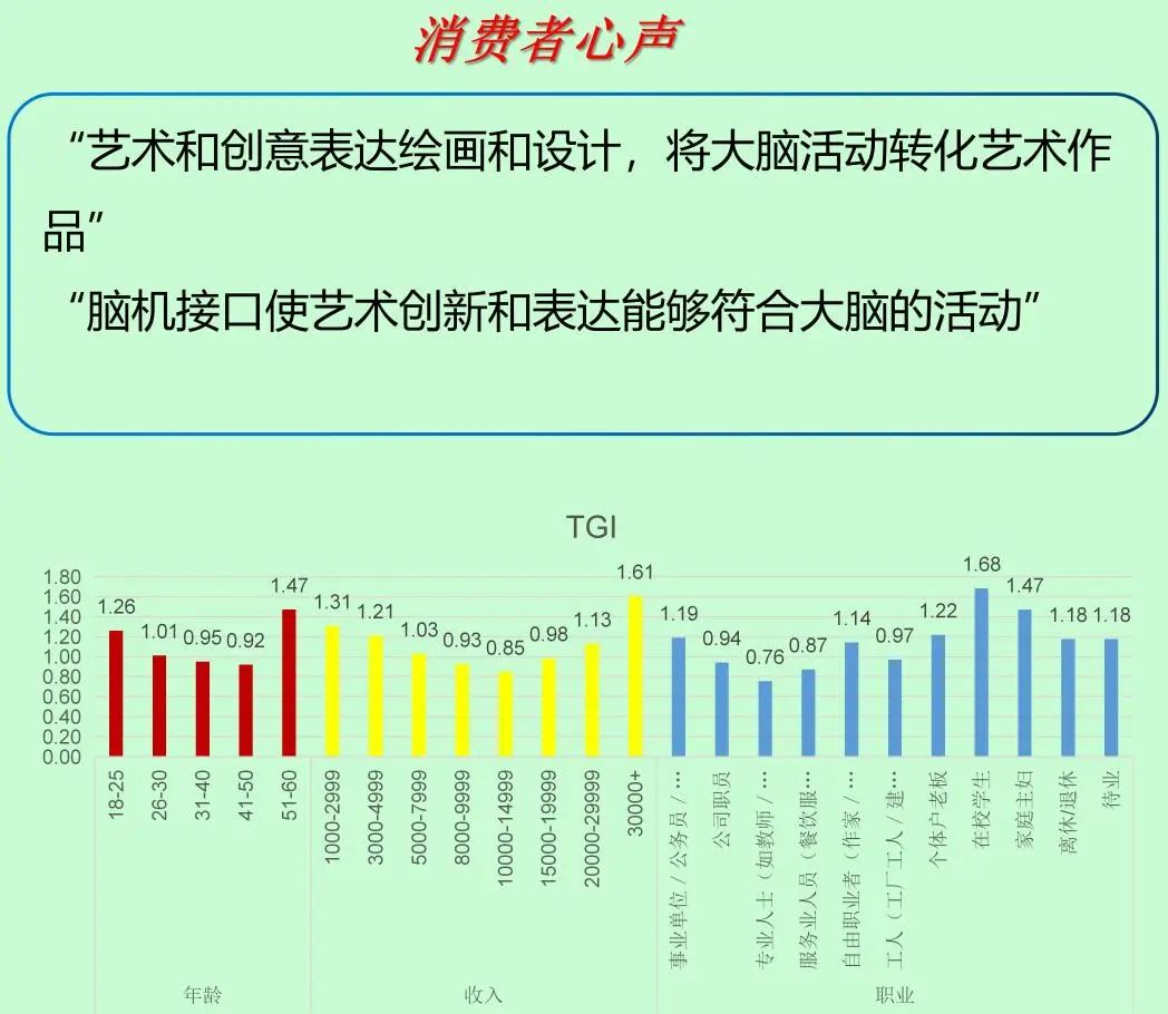 腦機接口技術在藝術創意表達方面的應用非常廣泛, 如腦機繪夢,新型藝術創作、探索情緒在藝術中的傳遞與影響等,藝術家可以直接將腦電信號轉化為繪畫元素,生成抽象畫等藝術作品,或者利用腦機接口技術,能夠將思維和情感轉化為創造性作品,為藝術創作帶來全新的可能性。調查顯示,18-30、51-60歲、高收入人群、自由職業等對這一場景關注度較高。