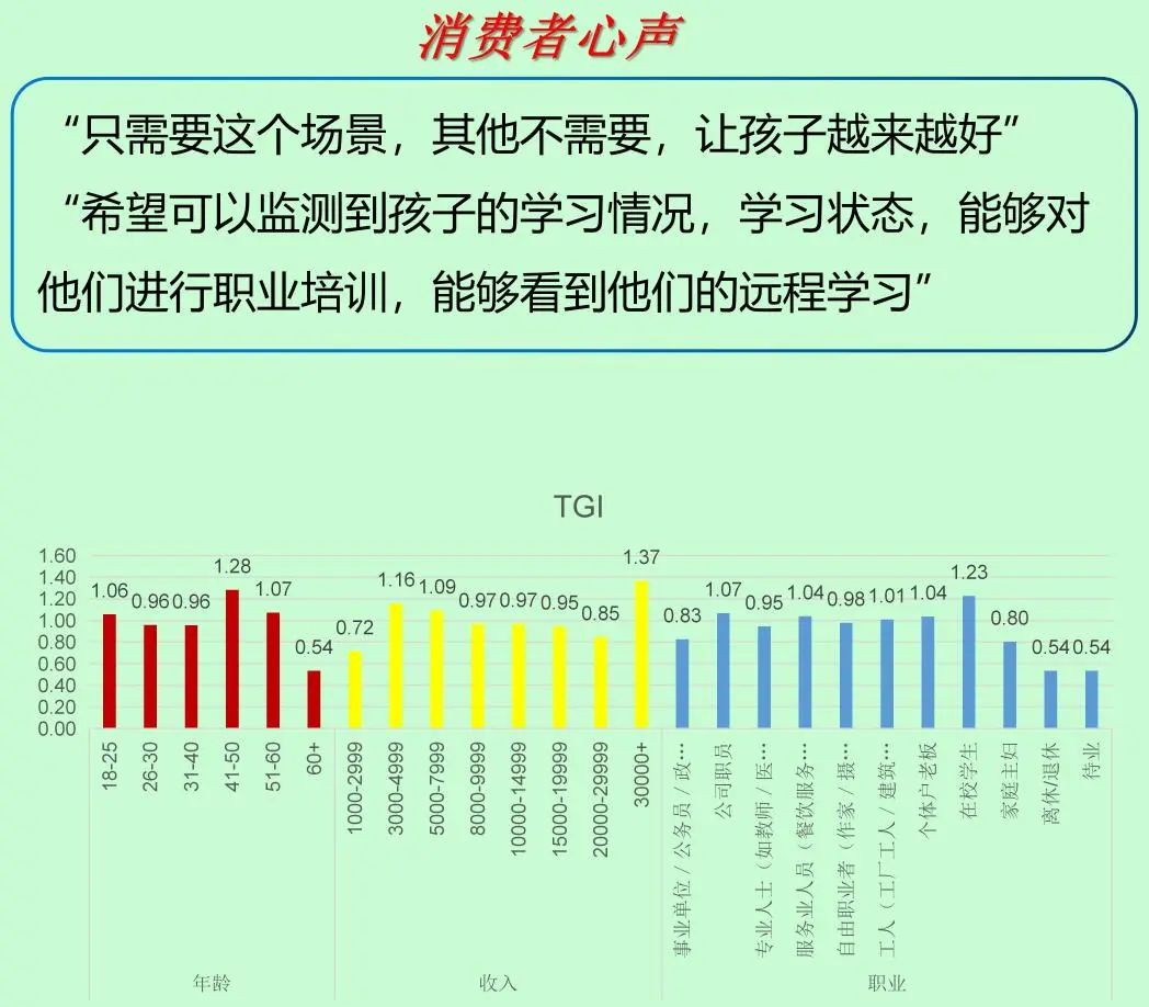 腦機接口技術通過精確捕捉學生的腦電波模式,深入分析其認知特征和情緒反應,從而為每個學生提供高度個性化的學習體驗。這種技術能夠實時監測學生的注意力水平和學習狀態,使教育者能夠及時調整教學內容和方法,以更好地適應學生的學習節奏和理解能力。此外,腦機接口還能夠監測記憶鞏固過程中的腦電活動,幫助教育者優化學習任務的安排,以促進長期記憶的形成。調查顯示,各個年齡段對提高學習效率、增強記憶力的關注度較為均衡,公司職員、專業人士和學生對這一場景關注度較高。