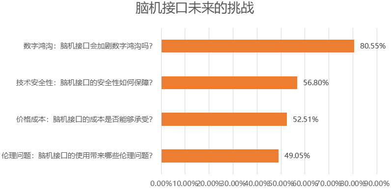 調研發現,消費者對腦機接口帶來的數字鴻溝最為擔憂,腦機接口技術作為一種前沿技術,其高昂的研發和應用成本可能加劇數字鴻溝,使得只有經濟條件較好的群體能夠享受到相關技術帶來的便利,如果技術普及度不高,可能導致技術獲取不平等,從而擴大數字鴻溝。