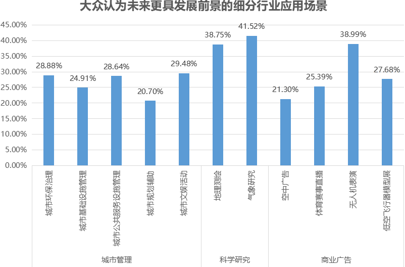 在城市管理場景中,低空經濟通過無人機技術的應用,預計將實現更高效、智能的城市監控和維護,提升城市運行的安全性和效率。調查顯示,在城市管理領域,城市環保治理、公共服務設施管理、城市文娛活動將更具發展前景。