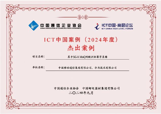 近日,中國國際信息通信展在北京成功舉辦,在這個亞洲最具影響力的通信展會上,由行業專家組成的評審工作組經過多輪篩選,評選出2024ICT中國優秀案例。中國移動研究院攜手中國移動、華為憑借其領先的創新能力和優秀實踐,以基于5G-A MoQ的賽事直播業務榮獲“2024年中國ICT優秀案例”獎。