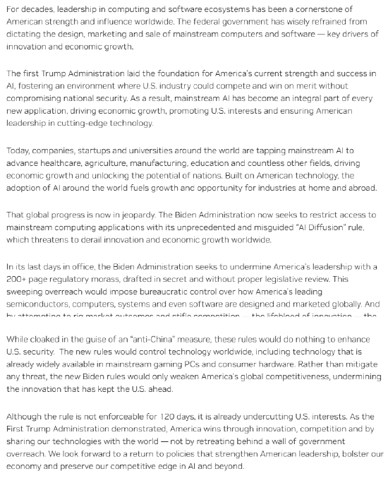 當地時間周一,美國政府宣布了有關“AI擴散”的新規定,將進一步限制AI芯片和技術出口。芬克爾對此表示,這份史無前例、具有誤導性的新規定有可能破壞全球創新和經濟增長。