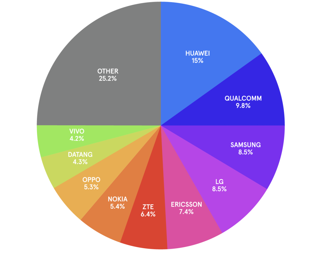 報告中詳細列出了位居前十的 SEP 權利人,分別為華為、高通、三星、LG、愛立信、中興通訊、諾基亞、OPPO、大唐電信和 vivo。華為的份額占比達到了 15%,遠遠甩開第二名高通(9.8%)。