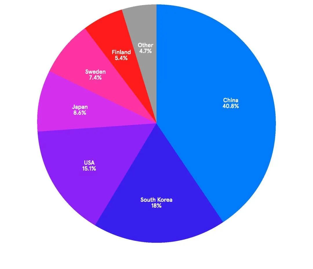 按最終權利人國別統計的 5G 標準必要專利(SEP)家族數量來看,中國排名第一,占比達 40.8%