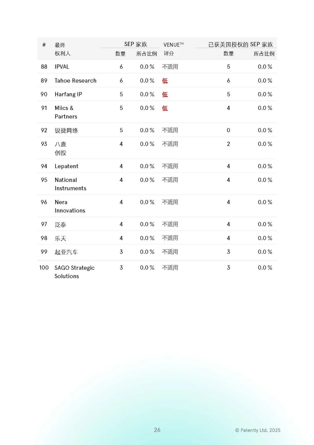 IT之家附 2025 年全球 5G 標準必要專利(SEP)百強權利人榜單如下: