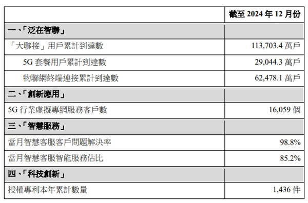 數據顯示,截至2024年12月份,中國聯通“大聯接”用戶累計達11.37034億戶,物聯網終端連接累計達6.24781億戶,5G行業虛擬專網服務客戶數達16059個,當月智慧客服服務問題解決率達98.8%,當月智慧客服智能服務占比達85.2%,授權專利本年累計數量達1436件。