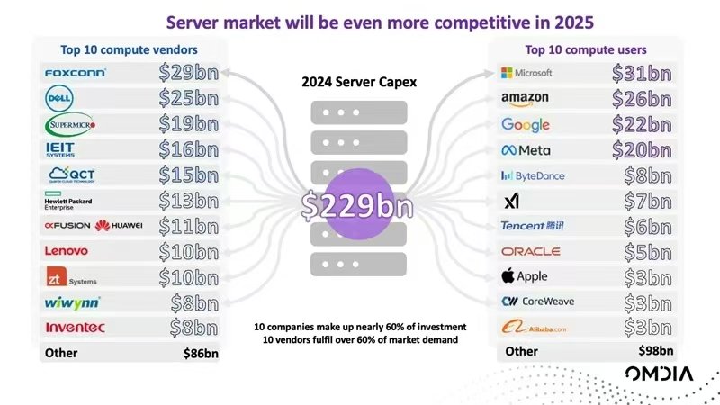 從資金走向看,Omdia表示,2024年服務(wù)器投資出現(xiàn)了高度集中化的情況。服務(wù)器客戶用于服務(wù)器的資本開(kāi)支2290億美元,支出最多的是云廠商微軟、亞馬遜、谷歌和Meta,服務(wù)器廠商中,富士康、戴爾和超微電腦銷售額則排名前三,其中富士康銷售額290億美元,超過(guò)戴爾的250億美元。