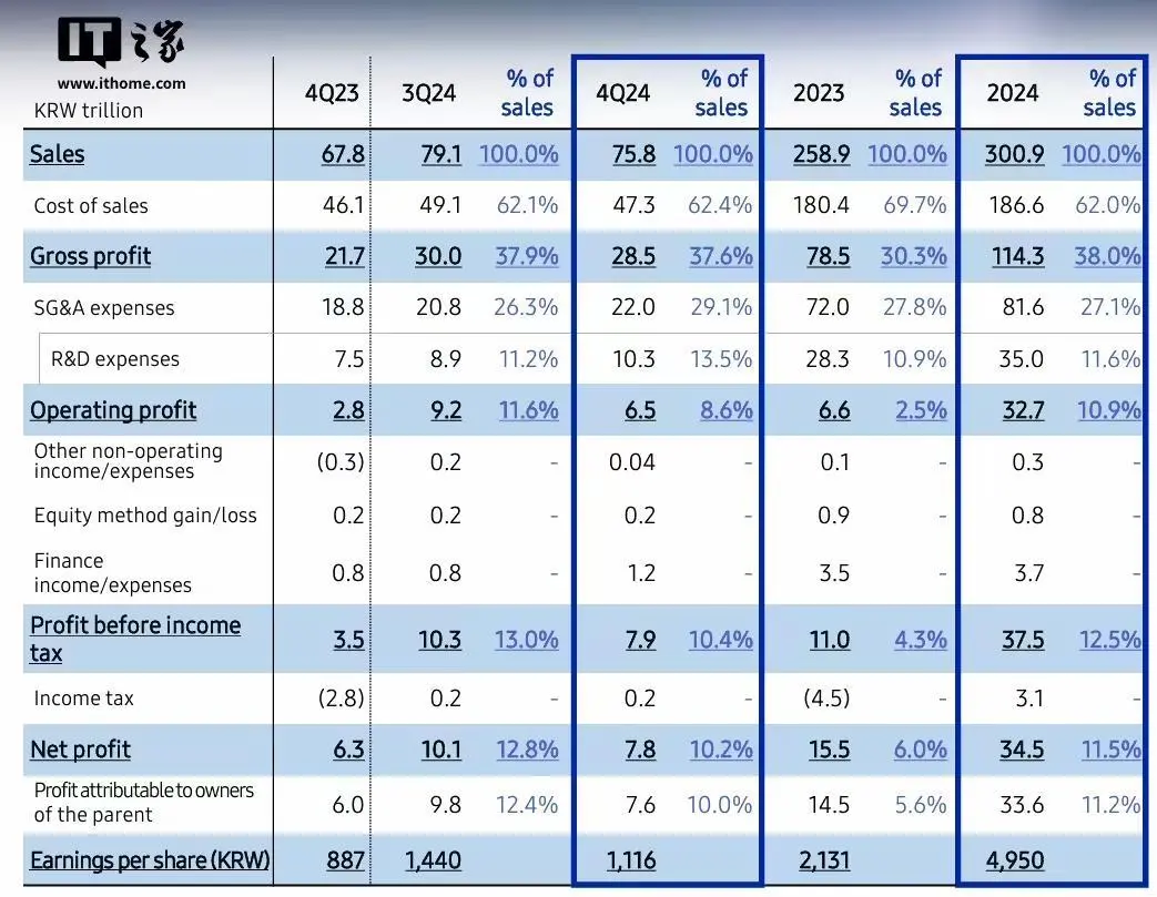 1 月 31 日消息,三星電子今日發(fā)布 2024 年 Q4 及全年財(cái)報。其中,三星電子 2024 年 Q4 營收 75.8 萬億韓元(IT之家備注:當(dāng)前約 3818.05 億元人民幣),同比增長 12%;營業(yè)利潤 6.5 萬億韓元(當(dāng)前約 327.4 億元人民幣),較上年同期 2.8 萬億韓元飆升超 130%。歸母凈利潤為 7.6 萬億韓元(當(dāng)前約 382.81 億元人民幣),同比增長約 27%。
