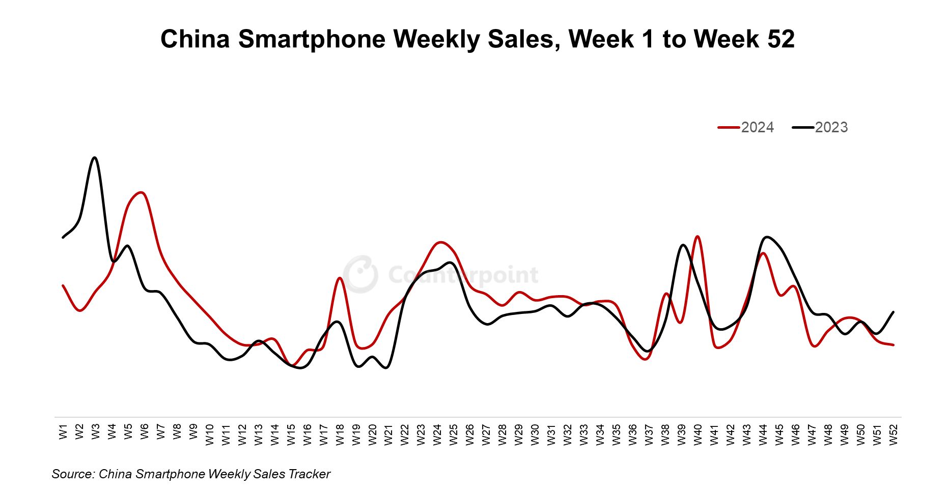 根據(jù) Counterpoint 的中國(guó)智能手機(jī)周度銷量追蹤數(shù)據(jù),2024 年中國(guó)智能手機(jī)銷量同比增長(zhǎng) 1.5%。但市場(chǎng)表現(xiàn)并不均衡,年初和年末都相對(duì)疲軟,不及上年同期;不過(guò),從第 5 周到第 36 周,銷量普遍好于去年同期。IT之家附上圖片如下: