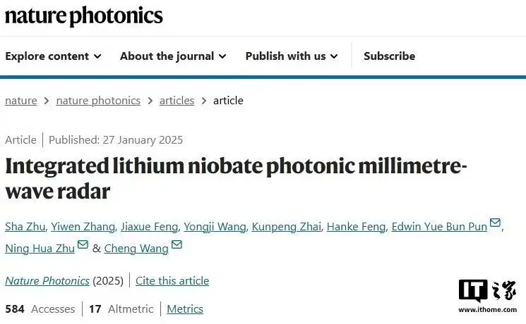 1 月 31 日消息,據新華社報道,南開大學攜手香港城市大學,成功研制出薄膜鈮酸鋰光子毫米波雷達芯片,在毫米波雷達領域取得重大突破。這一創新成果,為未來 6G 通信、智能駕駛、精準感知等前沿領域的應用奠定了堅實基礎。